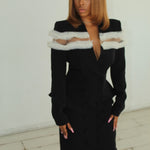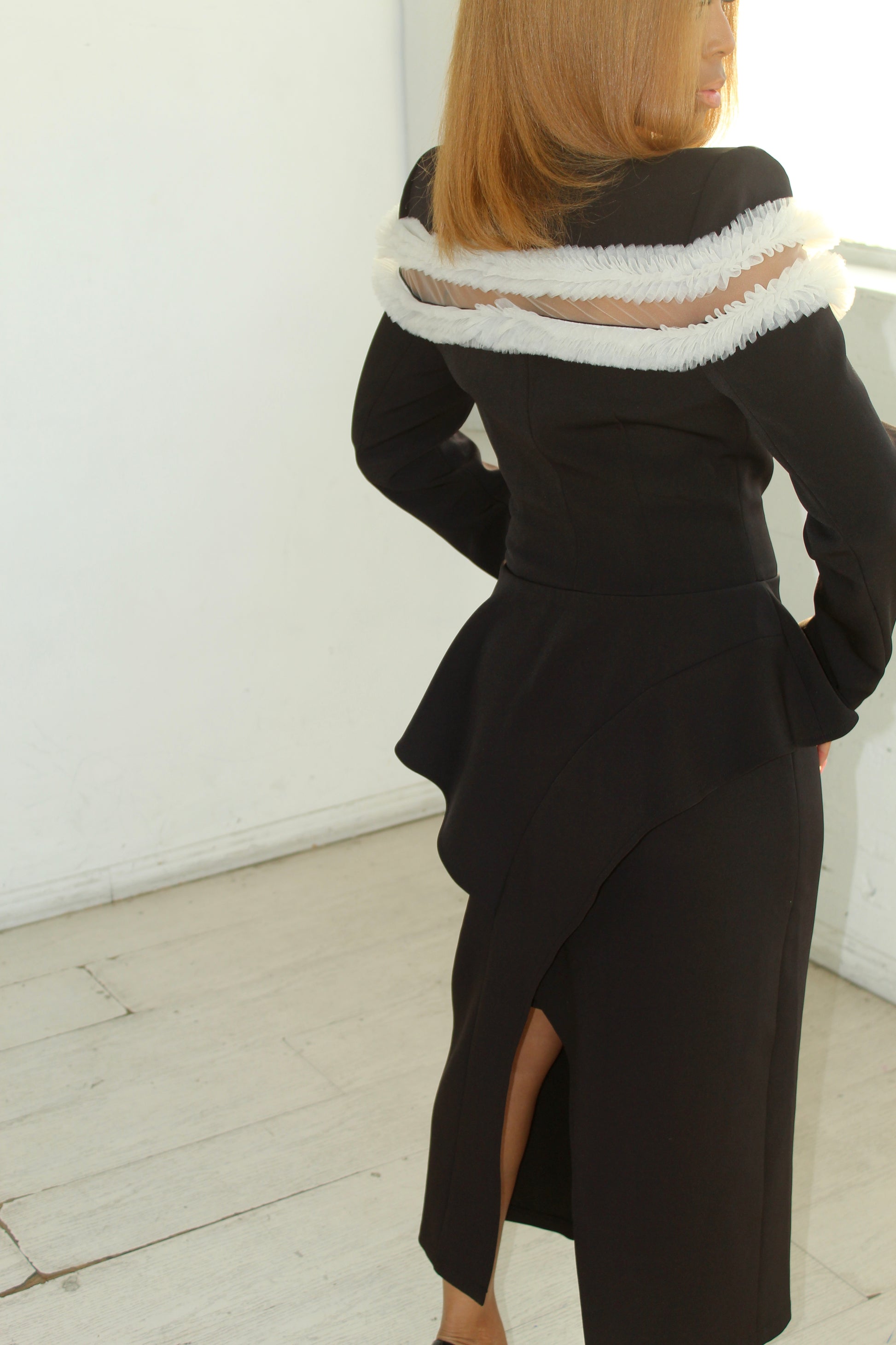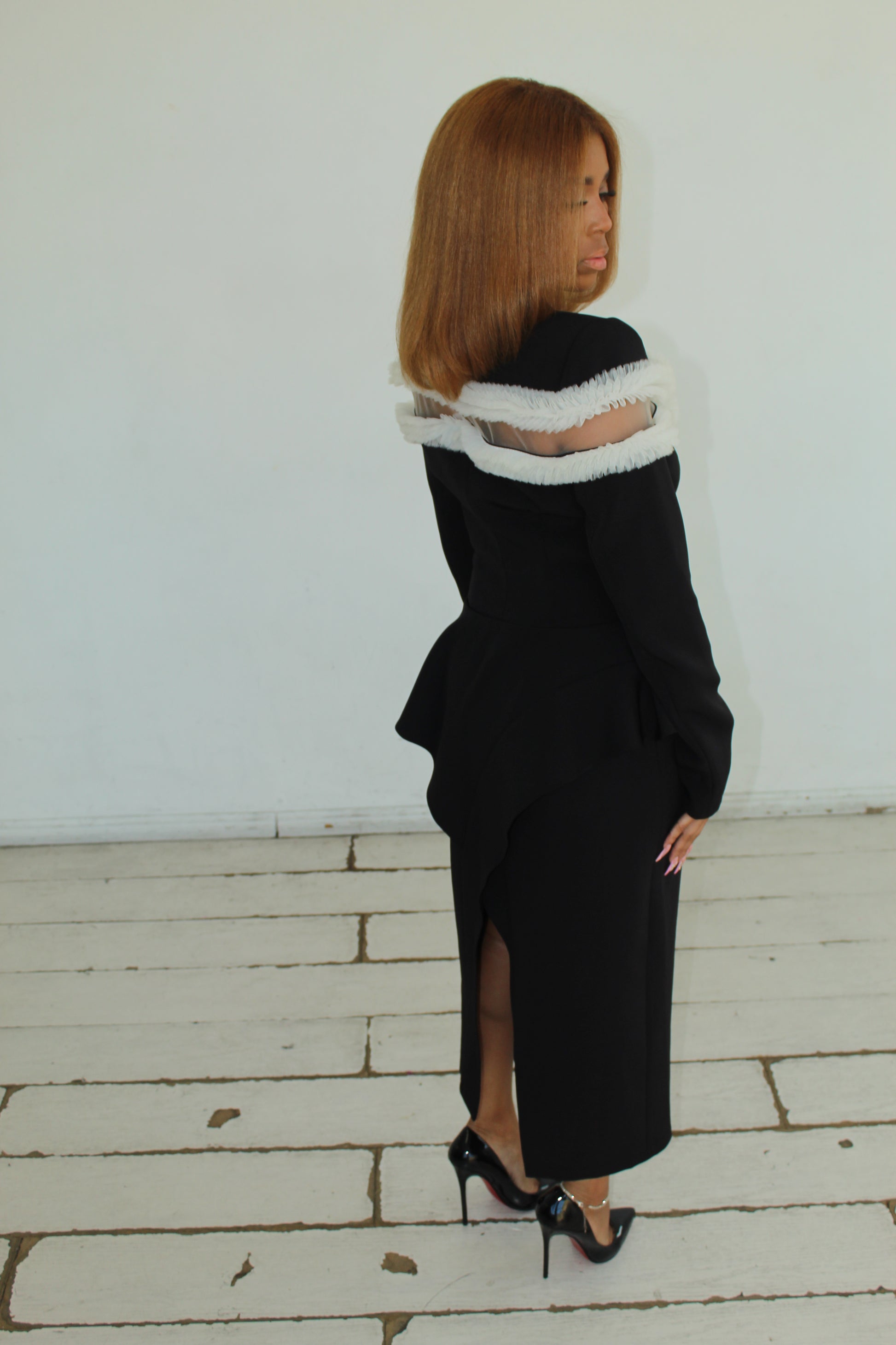 We’re obsessed with the Sheer mesh shoulder panels with layered ruffle trim, blending elegance with modern edge. Tailored, double-breasted silhouette with structured shoulders and a cinched waist for a flattering fit.