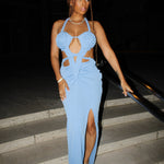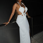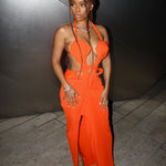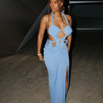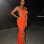 Intricate rope-style knot detailing at the bust and waist and you’ll love the figure-flattering silhouette. The draped skirt flows effortlessly with every step, complemented by a front slit that adds just the right amount of drama. A daring yet sophisticated look.