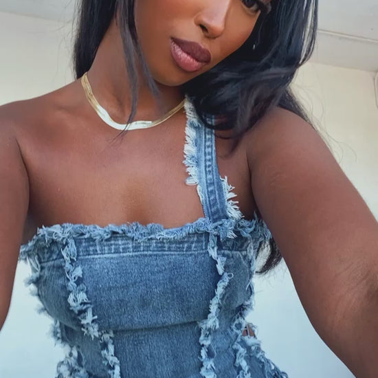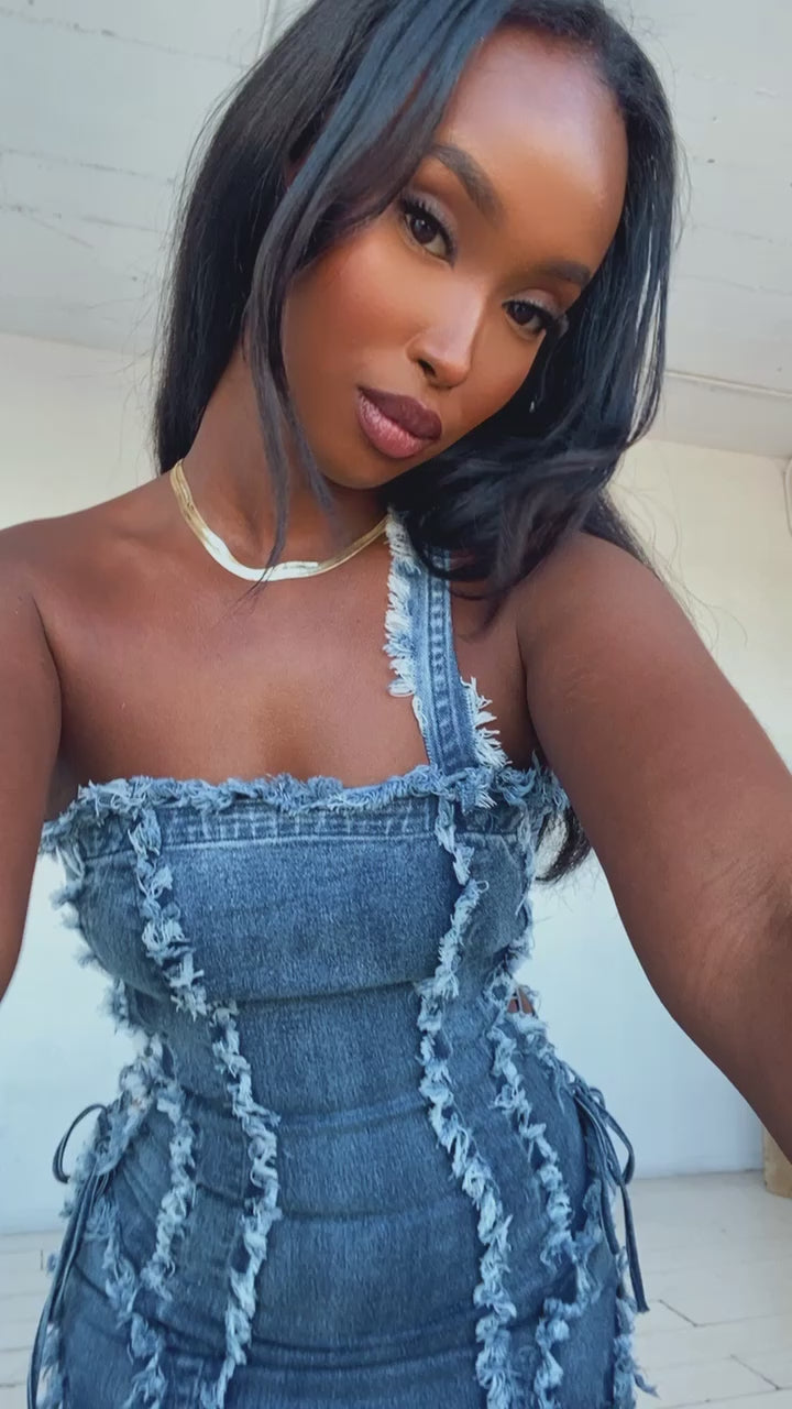Denim Matching Drawstrings that Tie on Both Sides Pulling in Waist