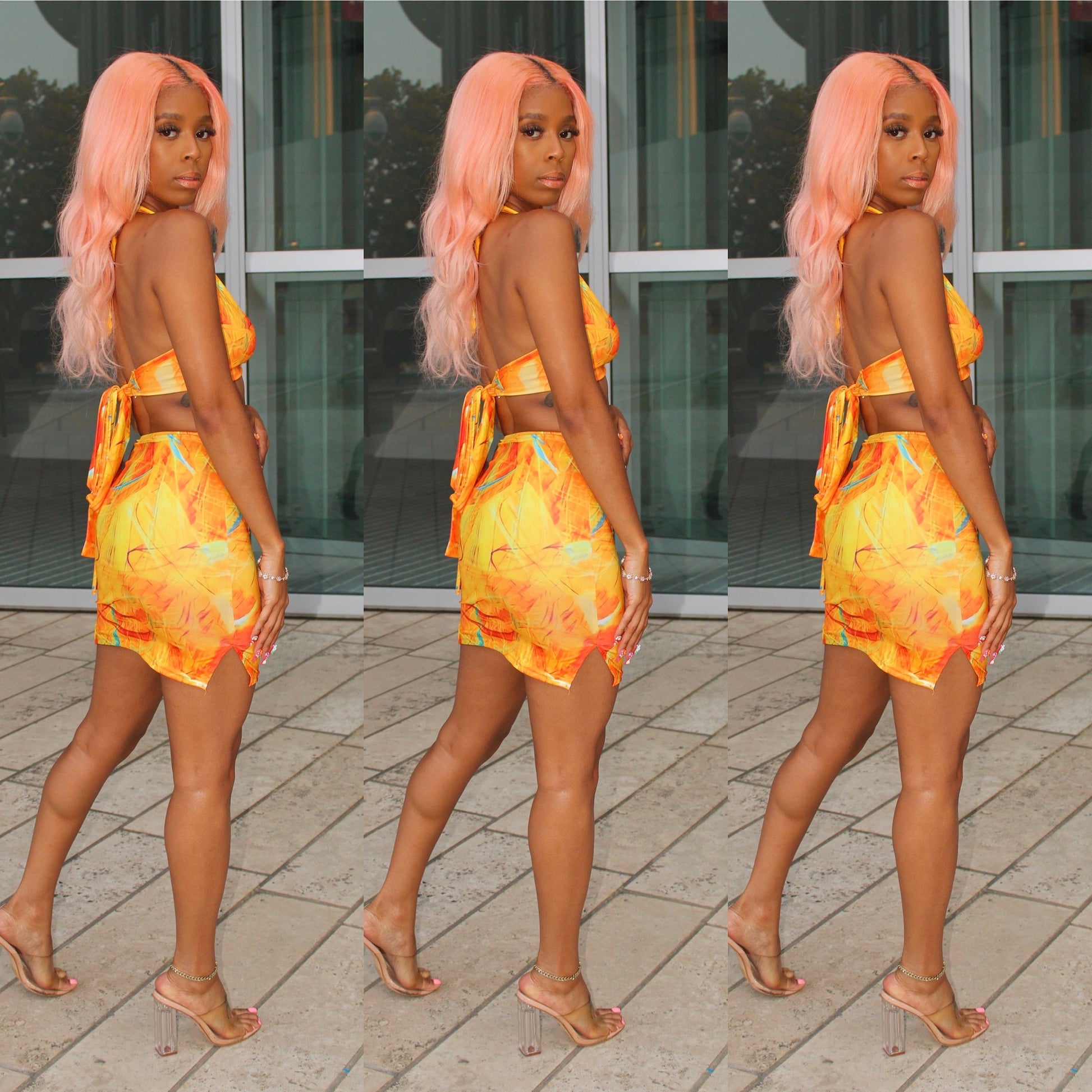 We are loving this cute little skirt set. We love the printed fabric and cute details. Super comfortable and stretchy. Perfect for girls night out or date night.