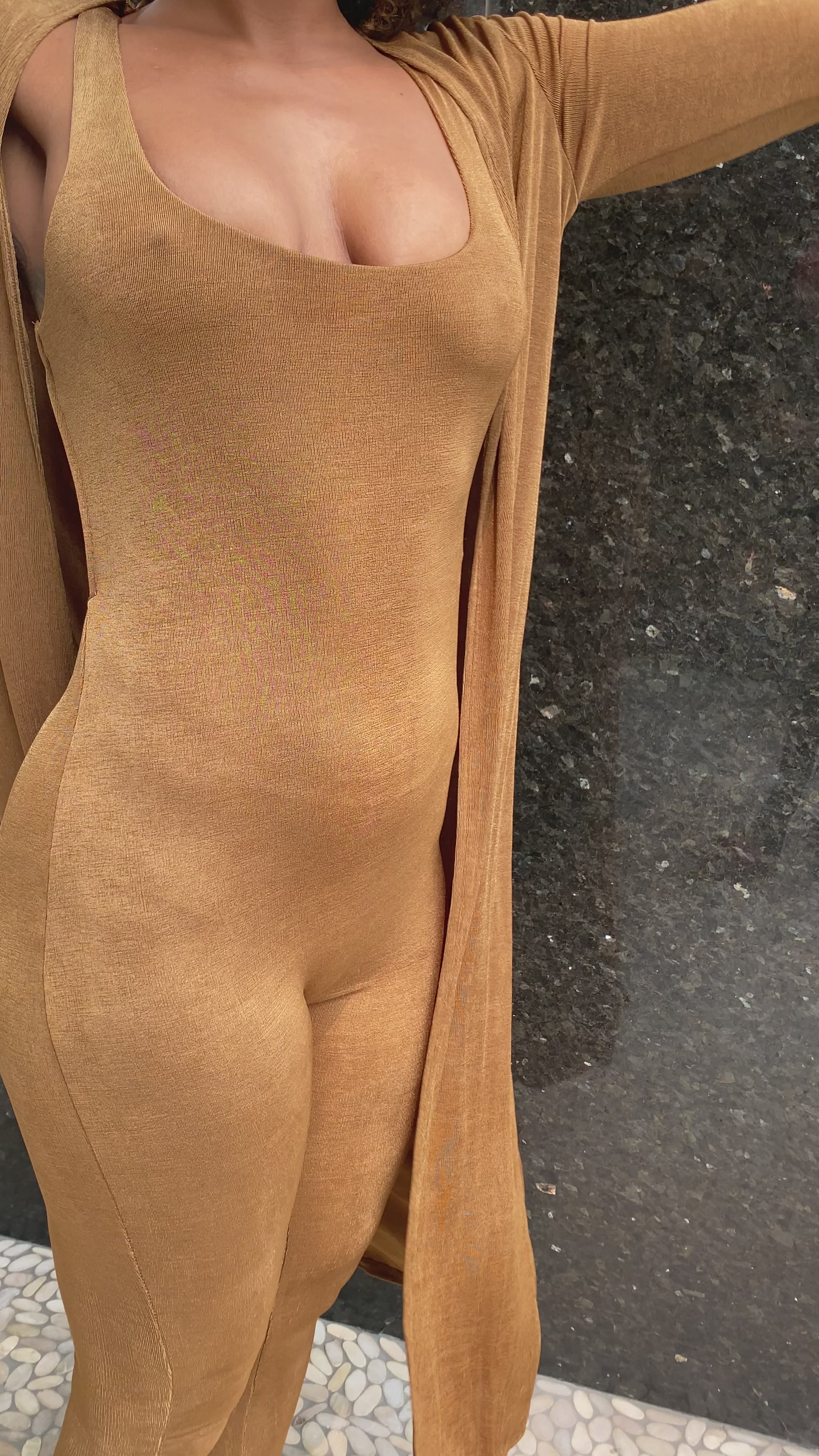 Honey you are going to love this jumpsuit set. The perfect Cognac Dustier paired with a matching Jumpsuit. The form fitting fabric is so comfy. Chill but cute. Easily your favorite throw on!