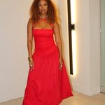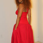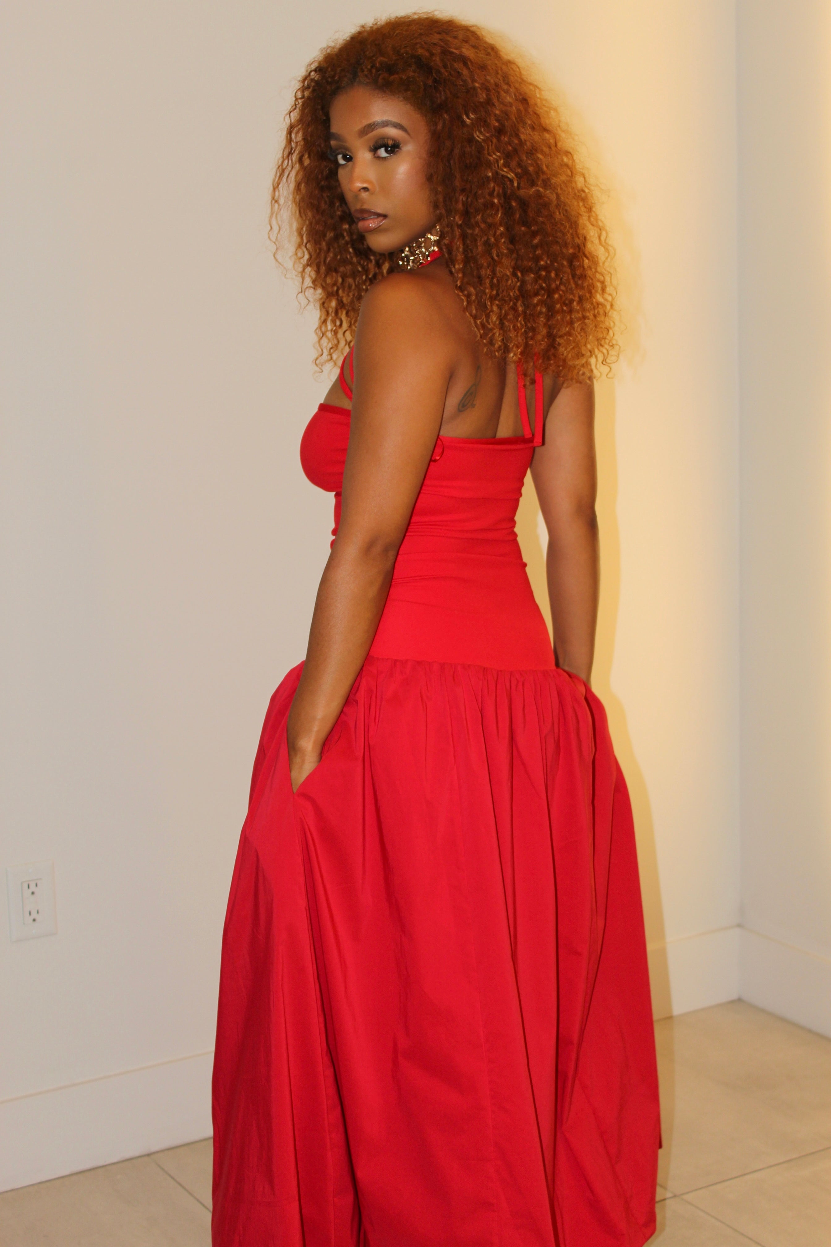 Rubi is a definite must have. She's perfect from her vibrant red color, to the high quality gorgeous contrast fabrics. We love the mixed textures and structure. Flattering on all body frames. Straps can be tied different ways for multiple looks. Did we mention she has pockets! Yes, add her to the cart.